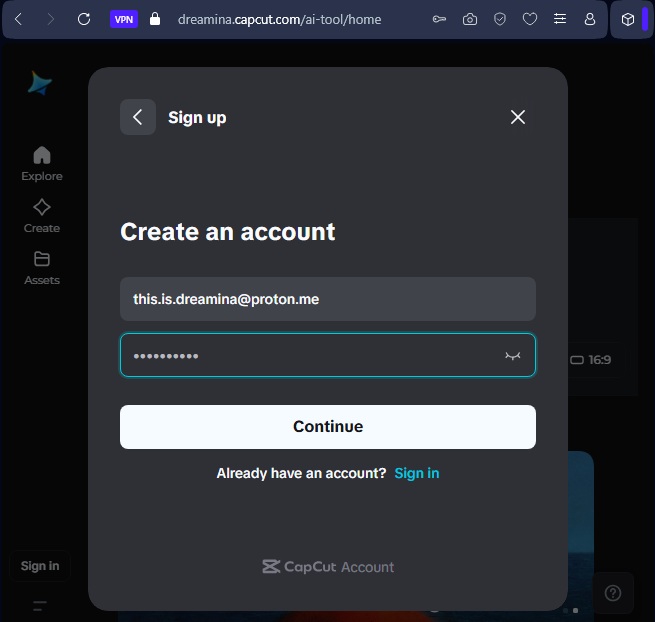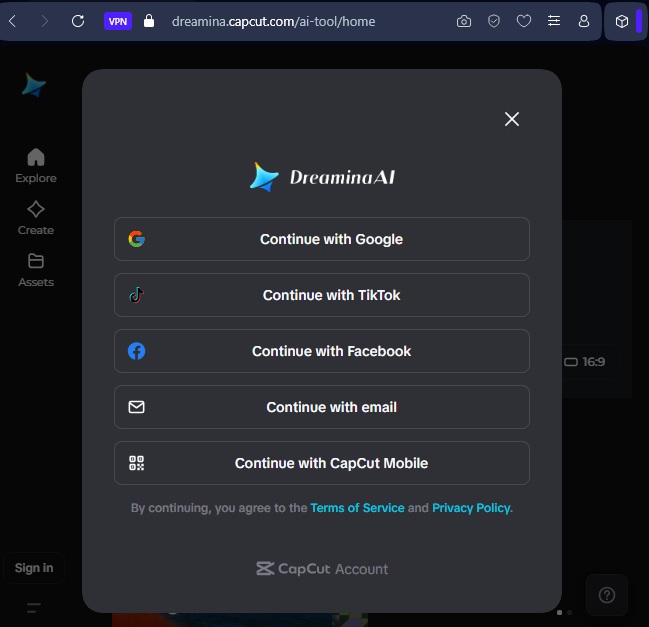 Opera browser has a built-in free VPN which is required to create and access a Dreamina account from the US/International region.