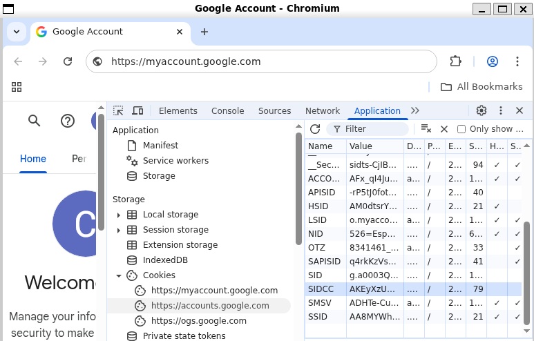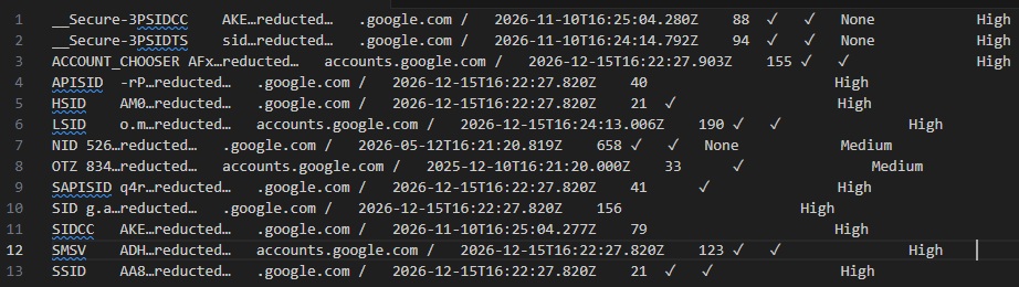 Your cookies will look similar to what you see below, we redacted values for brevity.