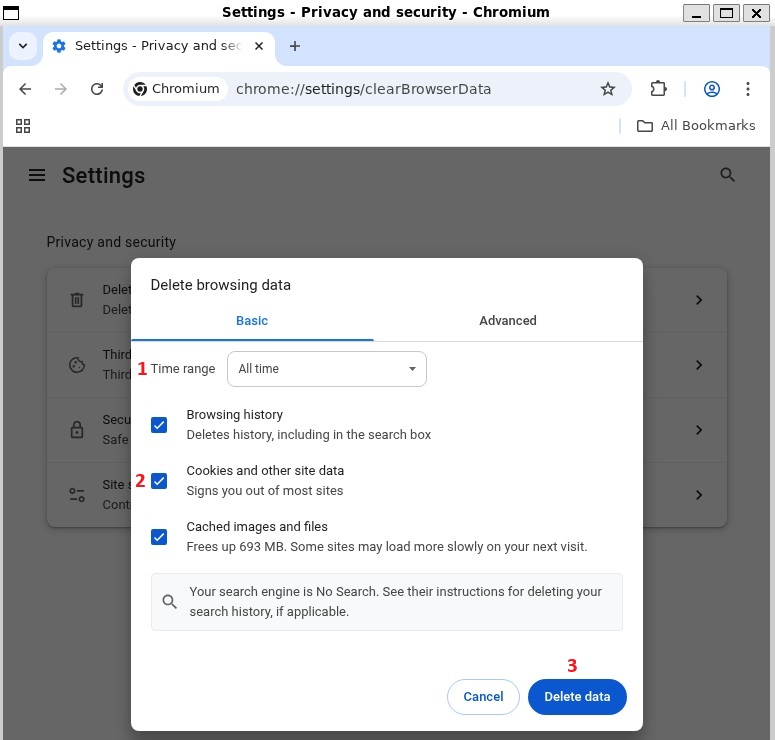 Select time range to be All time 1 and check Cookies and other site data 2, click Delete data 3