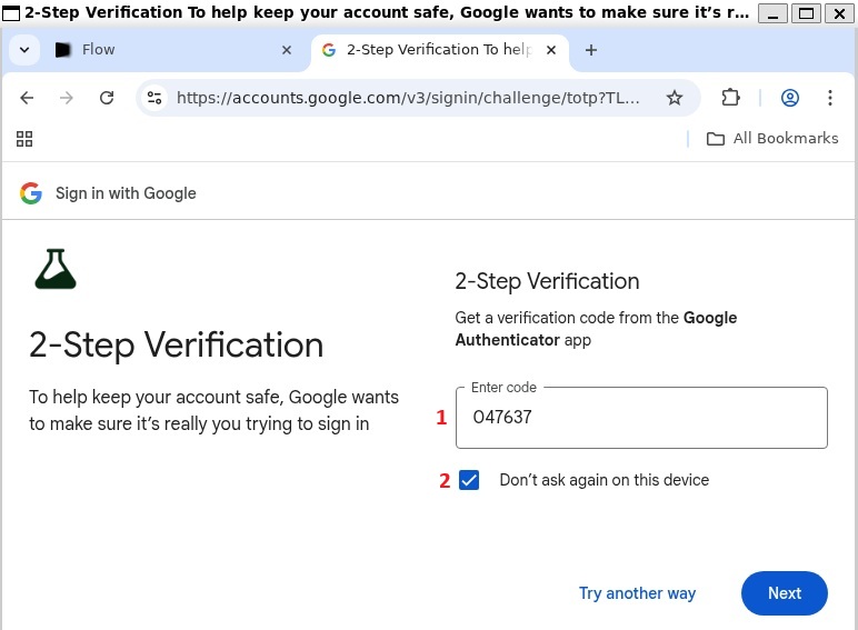 Enter 2-Step Verification code 1 and make sure to check Don't ask again on this device 2 - this is very important.