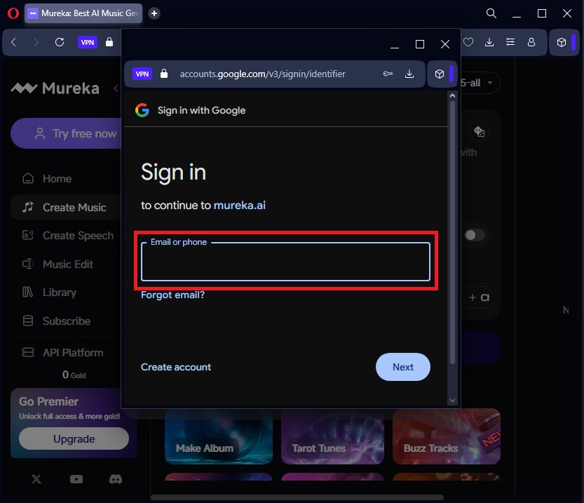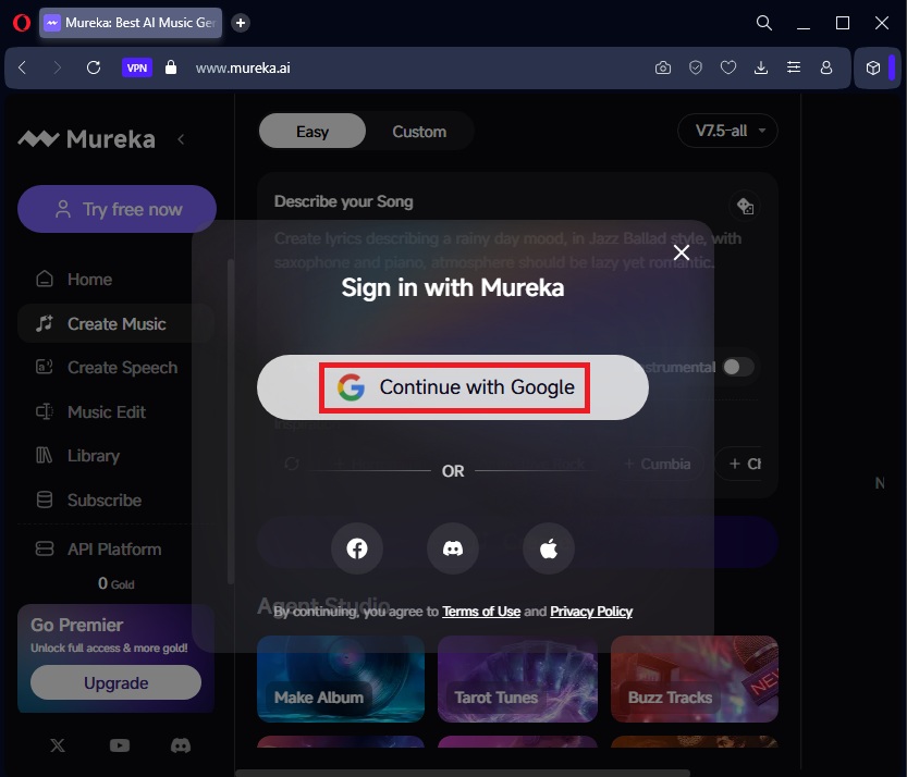Navigate to Mureka and login with Google